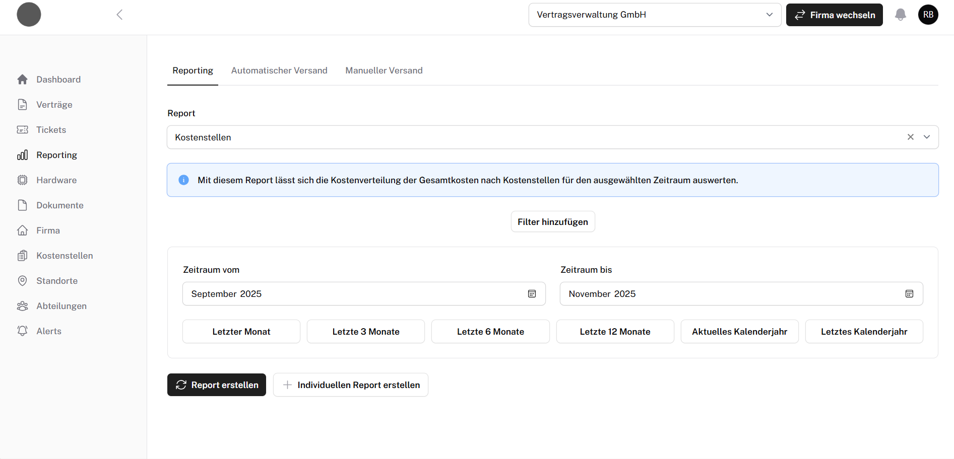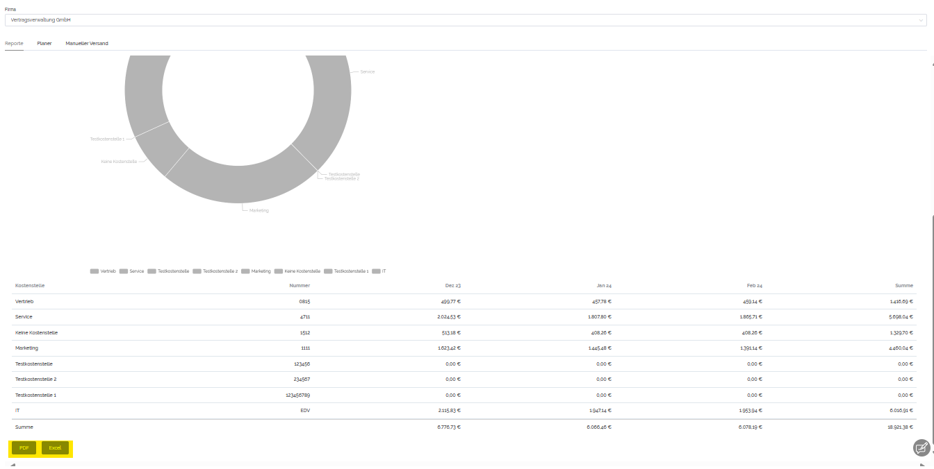 Wenn ihr beispielsweise für die Buchhaltung einen Report mit der Verteilung der Kosten nach Kostenstellen braucht, könnt ihr euch diesen erstellen und auch als PDF und Excel-Datei herunterladen.