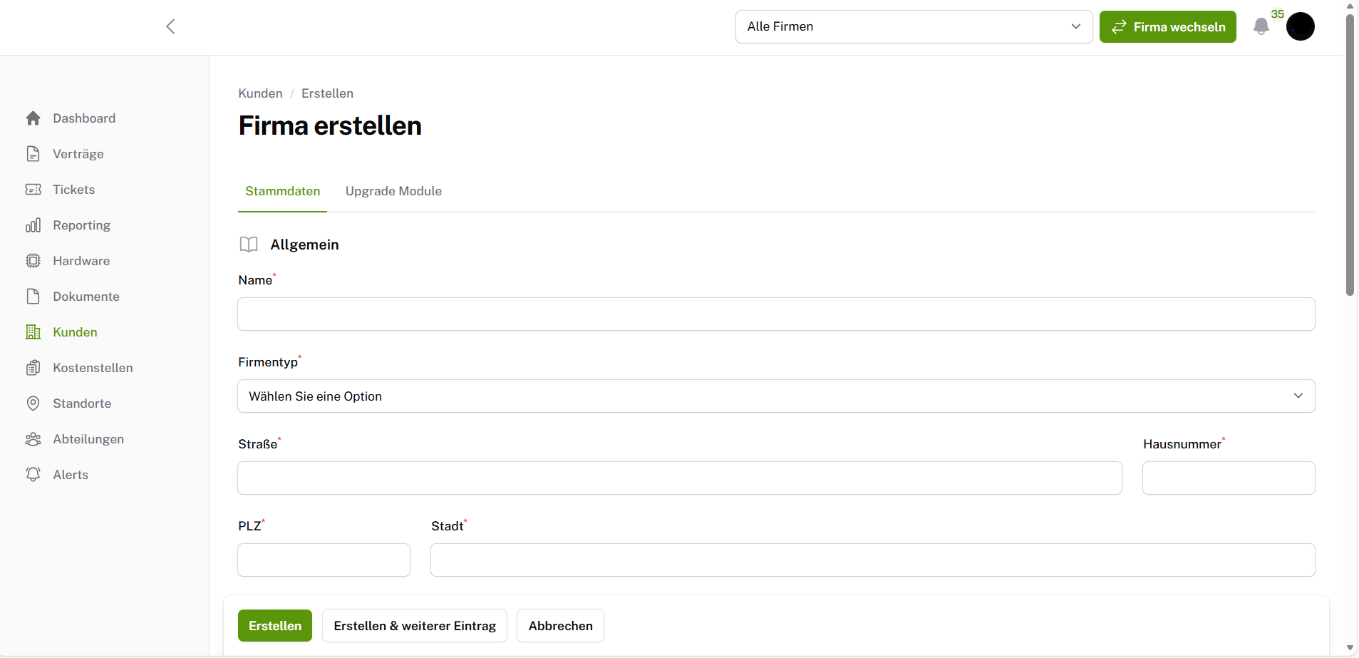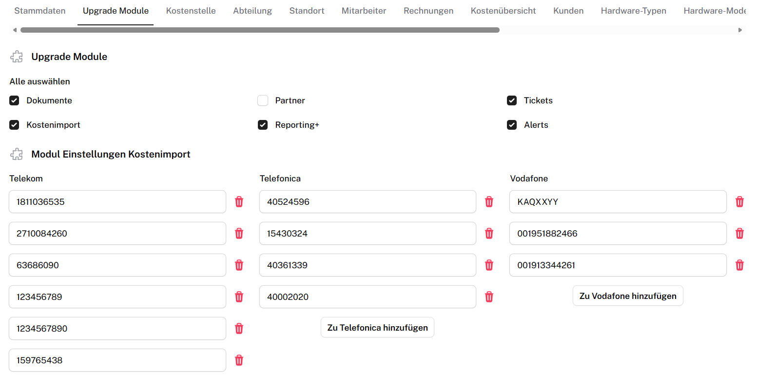 Zudem müsst ihr die Kundennummer der jeweiligen Anbieter bei dem Anbieter hinterlegen, da dies für die Zuordnung der Rechnungen notwendig ist. Dies macht ihr bei Meine Firma unter dem Reiter Upgrade Module.