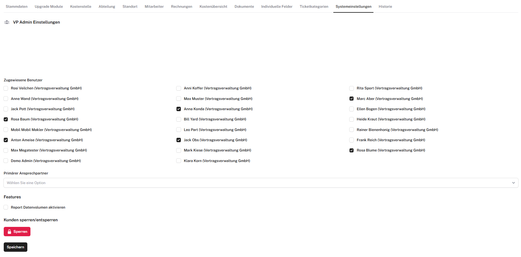 Im Reiter Systemeinstellungen eines Kunden können wichtige Zuordnungen und Funktionen für den jeweiligen Kunden eingestellt werden.