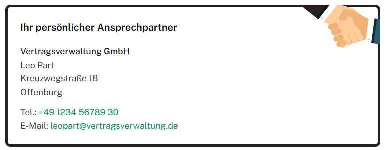 - Er wird in der Vertragsansicht des Partners als Interner Ansprechpartner ausgegeben.