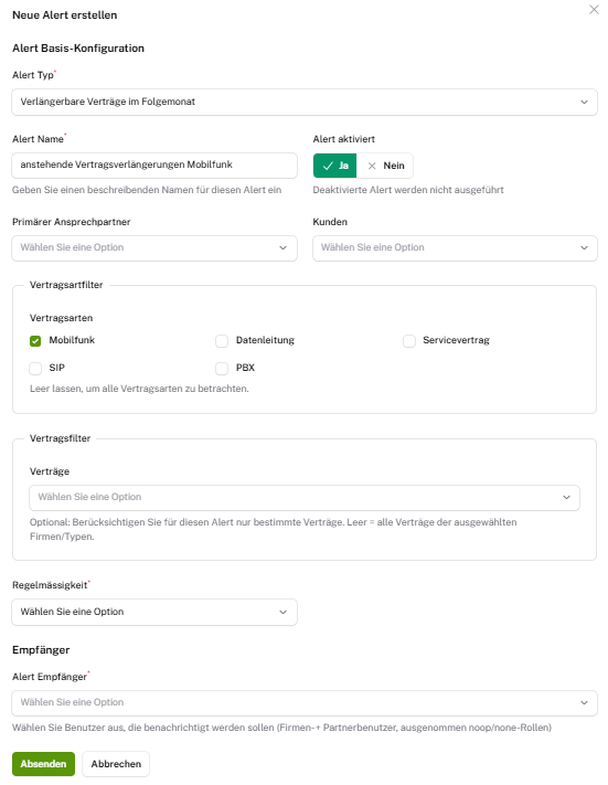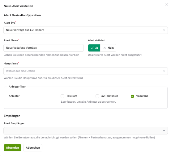 Man kann sich mit dem Aktivieren verschiedener Alerts automatisiert benachrichtigen lassen, wenn der ausgewählte Fall eintritt. Zum Beispiel wenn ein neuer Vertrag oder eine neue Rechnung importiert wurde oder das VVL eines bestimmten Vertrags erreicht wurde. Diese Daten werden aus dem Rechnungsimport entnommen.
