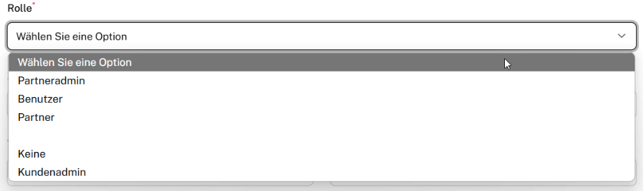Es können folgende Rollen zugewiesen werden: Partneradmin , Benutzer, Partner, Keine (Passivnutzer) und Kundenadmin,