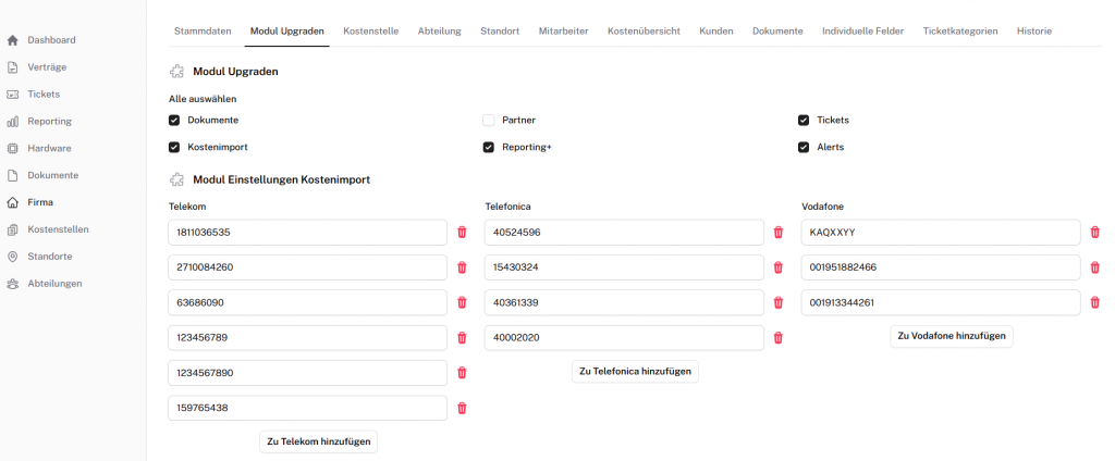 Unter Verträge wählt ihr den entsprechenden Vertrag aus, geht auf den Reiter Upgrade Module und könnt nun die Kundenkontonummern löschen oder dem passenden Anbieter zuordnen und erstellen.